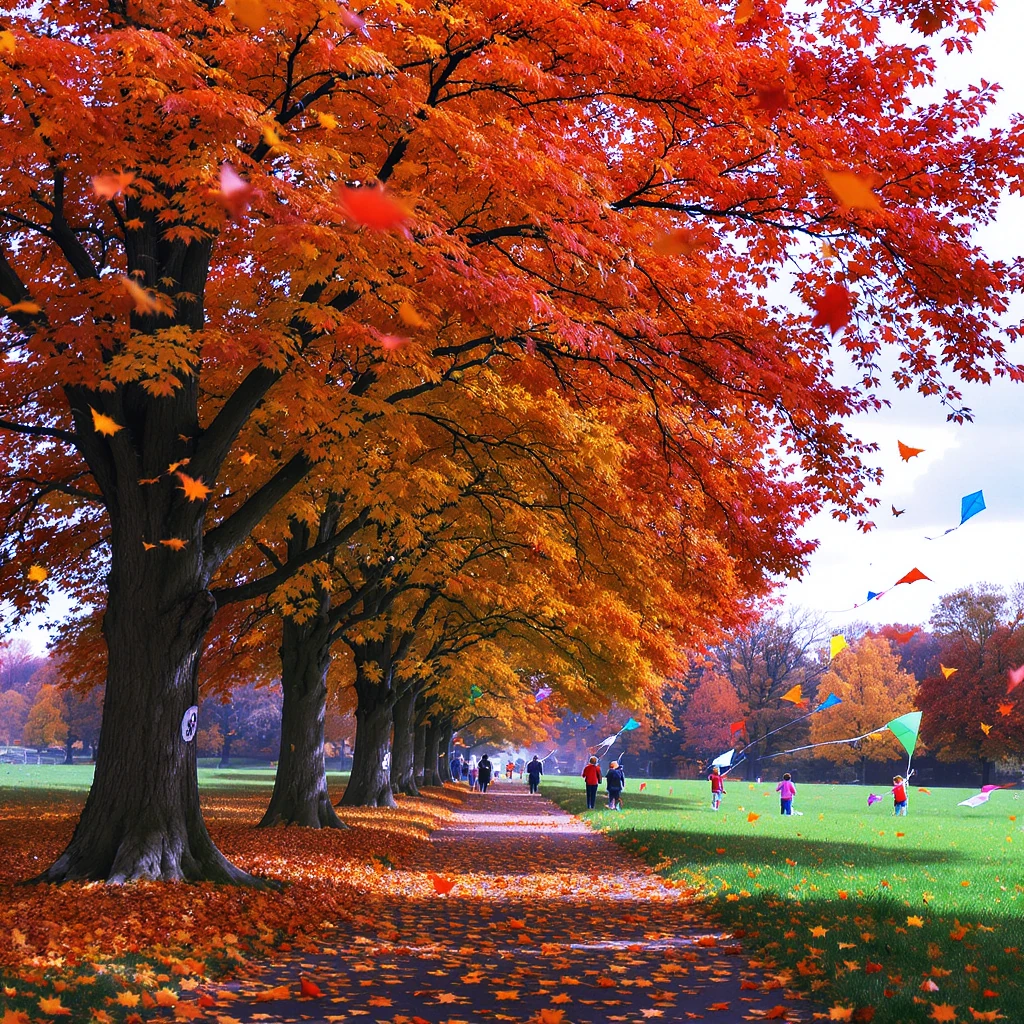 - Baum mit buntem Laub, davor, dahinter und darin hängend (abgestürzt) bunte Drachen